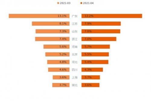 今年4月,用户购车意向占比最高的5个省份包括广东、江苏、山东、浙江、河南,广东以12.2%的意向占比独居鳌头。用户购车意向Top 10省份线索份额累计达63.1%,相较上月降低0.3%。全部省份中有12个省份用户意向占比有所增加,而11个省份的用户意向占比出现下滑,其中,河北、山东、北京相较上月用户意向占比分别增加0.6%、0.5%、0.3%,为购车意向占比增长最高的3个省份;广东、浙江、四川用户意向占比分别减少0.9%、0.4%、0.3%,为下降最多的3个省份。