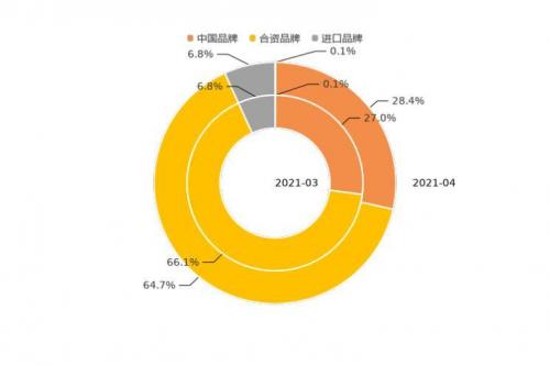 4月,合资品牌用户购车意向占比为64.7%,相对上月用户购车意向占比下降1.4%。中国品牌用户意向占比相较上月,增加1.4个百分点,达到28.4%,用户热度有所升温。
