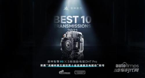 2022年1月9日,“龙蟠杯第五届世界十佳变速器及电驱动”评价结果发布,雷神智擎Hi*X混动电驱变速器DHT Pro从19款晋级产品中脱颖而出,荣膺“龙蟠杯第五届世界十佳变速器及电驱动”。同时,首搭DHT Pro的吉利星越L油电混动版获得“龙蟠杯第五届世界十佳变速器及电驱动车型”称号。这是继雷神智擎Hi*X在两个月前荣获2021十佳发动机后的又一大奖,混动专用发动机和3挡混动电驱变速器相继获得十佳称号,标志着一个由中国品牌引领的混动新时代已经来临。