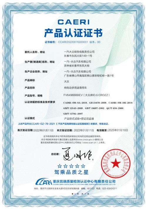 一汽-大众ID. CROZZ智能纯电家族,奉行坚持本心,“以用户为中心的”发展理念,不仅从设计方面塑造品牌个性,更是在续航、充电、安全性这些“看不见”的地方下足功夫,形成“品质”、“个性”兼具的产品ICON。就在近日,一汽-大众ID.6 CROZZ参加权威第三方检测机构中国汽研进行行业首个“驾乘品质之星”认证试验,通过操控安全、制动安全、足能动力、静谧低噪、感温舒适五大维度考核,获得五星“驾乘品质之星”产品认证证书。