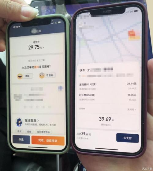 不过,在5月10日中午体验同样的快车业务,结果却有所不同。这段路程为12.1公里,用时25分钟,订单总计车费39.69元,司机所得29.75元,抽成金额9.94元,抽成比例25.04%。