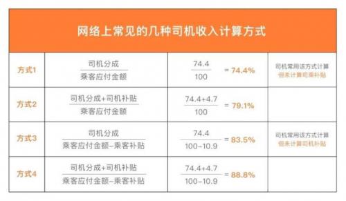 滴滴表示:司机收入=司机分成+司机补贴两部分组成。司机分成包含每笔订单的基础收入与其他收入;司机补贴则包含平台发放的各种激励奖励与节假日补贴。依照上图滴滴所披露的数据来看,较为准确的抽成范围为11.2%-20.9%。(分别为方式4和方式2计算得来)