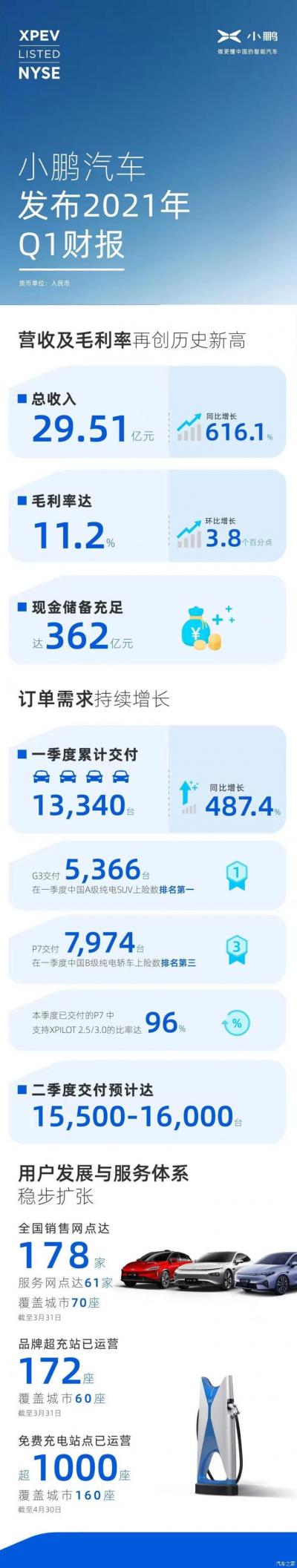 财报公布:一季度小鹏汽车新车交付量13340台,较2020年同期增长了487.4%;充电与营销服务网络方面,截至2021年3月31日,小鹏汽车的销售与服务网络已包括178家销售网点和61家服务网点,覆盖70个城市,小鹏汽车超级充电站已运营172座,覆盖60个城市。