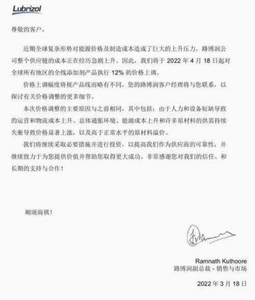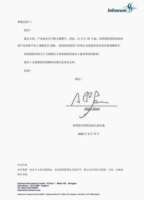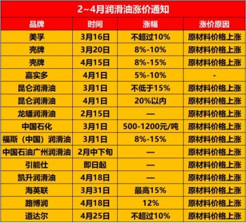 因产业成本大幅攀升,自3月31日起,润英联宣布将润滑油添加剂产品价格平均上调最高至15%。