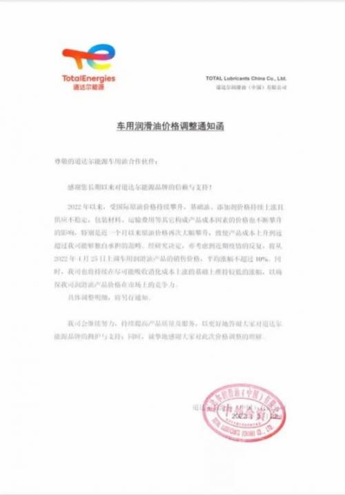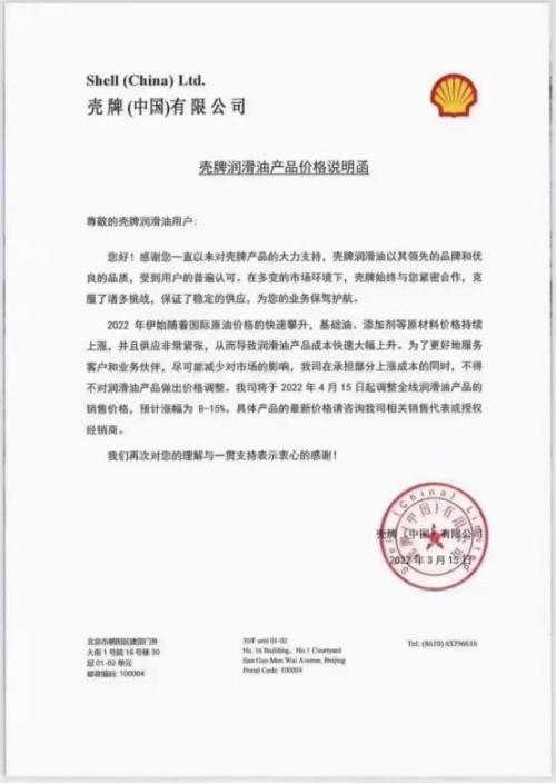 壳牌已经两次宣布涨价,第一次涨价宣布3月20起,涨价8%-10%。第二次涨价宣布自4月15日起调整全线润滑油产品的销售价格,预计涨幅为8%-15%。