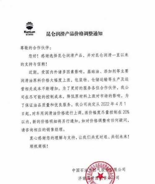 受国内外因素的影响,原材料价格以及生产成本不断增加,自2022年4月1日起,宣布对车用润滑油价格进行上调,涨价幅度控制在20%以内。这也是昆仑润滑油宣布的第二次涨价,第一次宣布从3月1日起涨价,涨价幅度不低于15%。