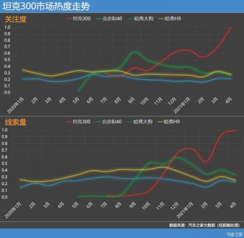 自曝光以来,坦克300的市场热度持续上升。汽车之家大数据显示,与竞品相比,其关注度和线索数量都持续攀升,今年更是一路大幅领先。坦克300的出道秉承了“过度投入、过度研发、过度配置”的“三过度”原则,集齐同级独有的1个硬核底盘、2把锁、9种驾驶模式的“大满贯式”配备,反正就是“给你!给你!都给你!拿去!拿去!都拿去!”,加上硬核与浪漫兼备的外形,停在一堆审美疲劳的BBA当中也绝对outstanding,收获青睐实在情理之中。
