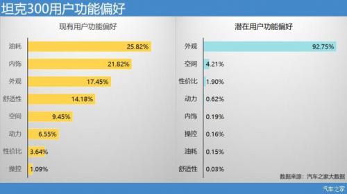功能方面,坦克300的高颜值是用户心水的第一要素,潜在用户中有92.75%的被其外观“俘虏”。但是根据现有用户的反馈,一旦到手,外观又排在了后面,油耗、内饰反倒成为点赞的功能项。