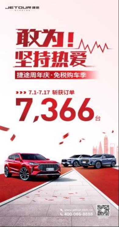 缤纷七月,捷途汽车特别推出以“同行4载,不负千万热爱”为主题的捷途周年庆*免税购车季活动,7月1日-17日之间,线上线下同步结缘用户,多重形式的优惠,尽显捷途汽车“旅行+”品牌温度。截至收官,累计成交订单量突破7366辆,再次彰显用户对捷途的热爱与拥趸。