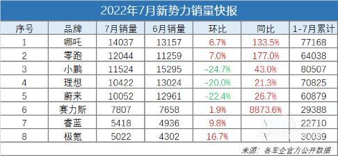 然而,新兴的造车新势力小鹏、理想、蔚来却超出市场预料,分别环比下滑24.7%、20%、22.4%。正当这三家造车新势力企业下滑之际之时,传统车企的新能源品牌却异军突起:赛力斯(更名前为小康股份)发布公告同比增长316.78%;吉利旗下的极氪创交付新高5022台,环比增长16.7%,睿蓝汽车则销量5418台,环比增长9.8%。
