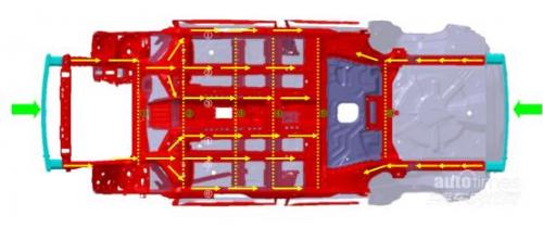 (新408车身地板设计了6道纵向及6道横向加强梁)