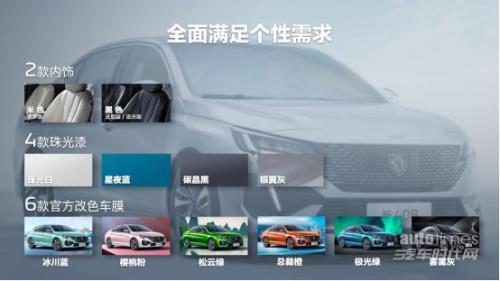 车身颜色上,新408除了提供珠光白、星夜蓝、碳晶黑、银翼灰4款珠光漆配色,还有6款官方改色车膜(冰川蓝、樱桃粉、松云绿、总裁橙、极光绿、雾霭灰),十种车色,全面满足用户的个性化需求。