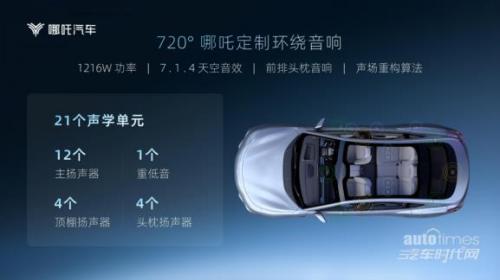 为了最大限度地丰富音乐的层次感、最大程度地还原音乐的真实度。哪吒S在中置、车门、顶头、头枕、以及三个woofer的位置搭载了21扬声器系统,声道布局进化到了7.1.4,并加持了行业领先的DSP芯片,拥有高速运算算力、毫秒级的处理速度,能够再现动人的声音,呈现丰满的虚拟环绕立体声效。功放最大输出功率达到了1216W。这一数据,几乎追平了劳斯莱库里南1300w的音响总功率,用户在看电影或听音乐时如果突然遇到高音,哪吒S的瞬时功率可以游刃有余地满足,不会有“力不从心”的情况,以震撼的音效塑造身临其境的现场感。