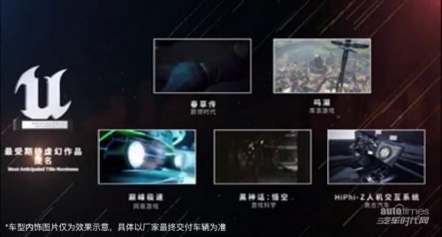 此次年度“最受期待虚幻作品”一共有5项提名,分别是:网易的《巅峰极速》、游戏科学的《黑神话:悟空》、库洛的《鸣潮》、高合汽车《HiPhi-Z人机交互系统》以及蔚领时代的《春草传》,高合汽车是唯一获得提名的汽车作品。