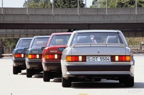 基于190E 2.5-16打造的190E 2.5-16 Evolution I是奔驰在80年代末的精髓之作,该车的诞生源于当时DTM德国房车大师赛的赛例要求:参赛车辆需就新改良的赛车,推出赛例要求数量的民用版本(至少500辆)。在动力、刹车、底盘、外观套件等各个方面此车都做了针对性的升级,极具战斗格调的空气动力套件令风阻系数低至0.29Cd,2.5L引擎最大马力204Ps/6750rpm,峰值扭矩240N·m/5000-5500rpm,匹配5速自动变速箱。
