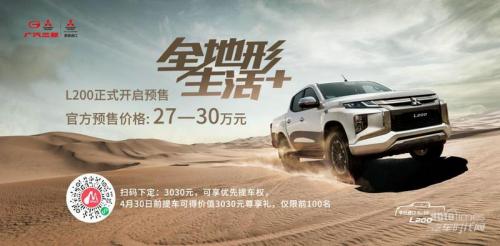 除了全新欧蓝德,广汽三菱亦于近期推出了又一经典款新车——由广汽商贸平行进口,在广汽三菱渠道进行销售的高端皮卡L200,携动感造型、质享空间、超选驾控、科技安全四大核心优势,共推出探趣版、探享版、探索版三款主力车型,并提供9大潮流色系。目前,L200已于广州车展正式上市并同步开启了新车预售,预售价格为27万-30万元,消费者只需3030元订金便可提前锁定这款三菱经典皮卡。