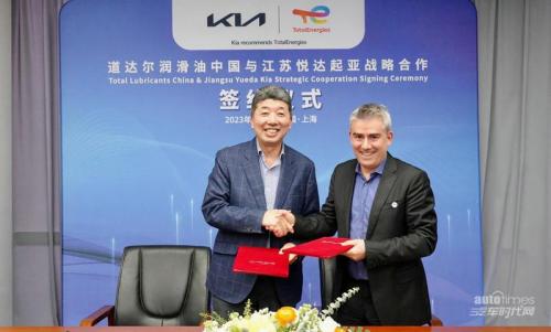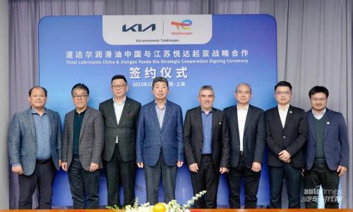2023年3月6日,江苏悦达起亚与全球能源公司道达尔润滑油再度携手,正式签署了战略合作协议,并举行仪式。江苏悦达起亚总经理金京鉉、首席运营官杨洪海、道达尔润滑油(中国)有限公司董事总经理帝龙、道达尔润滑油(中国)有限公司副总经理王啸晓等企业代表参与了本次仪式。
