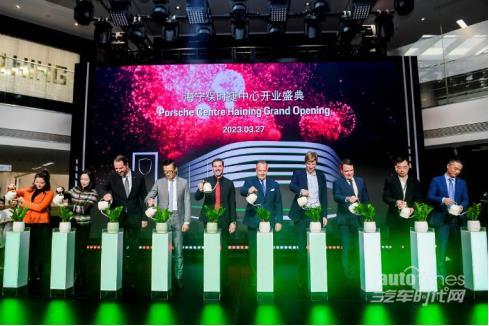 海宁保时捷中心盛大开业,从左至右:保时捷中国中区区域总监奚晨女士;保时捷中国传媒公关副总裁唐凤靓女士;保时捷中国渠道管理和拓展副总裁袁穆行先生;保时捷中国副总裁及首席运营官萧达先生;保时捷中国总裁及首席执行官柯时迈先生;捷成集团主席捷成汉先生;捷成集团行政总裁孟爱峰先生;捷成汽车董事总经理奕波先生;海宁经济开发区党工委副书记、海宁经济开发区管理委员会主任李振先生;海宁保时捷中心总经理陆明先生
