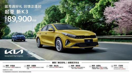 日前,定位驾趣新生代家轿的起亚新K3持续热卖中,回馈价仅8.99万元起!新车共推出6款车型,官方指导价区间为11.29万元-14.39万元,同时推出“春日好礼”——即日起至4月30日期间,购车即享补贴金、全额险、贴心礼、福利包、全员礼、金融购,价值超2.3万元限时六重好礼。