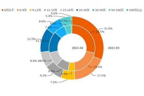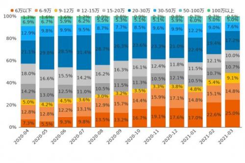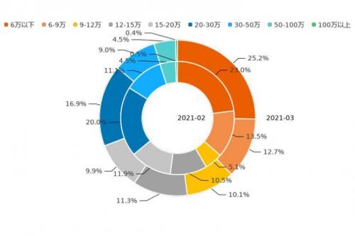 通过分析近12个月的用户意向数据发现,2020年04月至今年3月,12万以下价区用户意向占比增加23.8个百分点,低价市场热度有所升温;12-20万价区用户意向占比下滑11.5%,市场热度有所下滑;20万以上价区用户意向占比,下跌12.3个百分点,其中,30-50万价区市场热度下滑明显,近12个月线索占比下跌5.3%。
