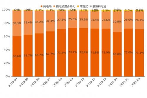 今年3月,新能源车中纯电动车型用户购车意向占比为71.1%,相较上月小幅下跌0.9个百分点;插电式混合动力车型购车意向占比为26.7%,与上月相比小幅上涨0.7个百分点;增程式车型用户意向占比为2.1%。