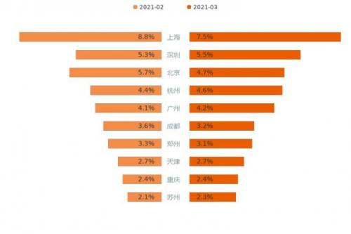 了解了用户购车意向的省份分布,我们再来看一下城市格局。今年3月,非限购城市的用户意向占比达67.8%,仍居市场主力。用户购车意向占比最高的5个城市包括上海、深圳、北京、杭州、广州,上海以7.5%的意向占比荣登榜首。