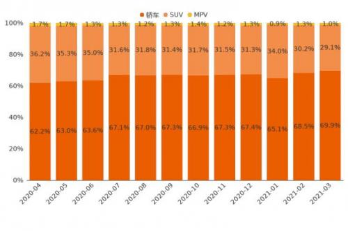 2、分车型级别走势:轿车用户意向占比持续上涨,SUV意向占比下滑