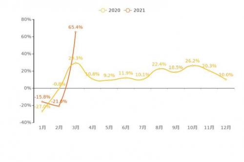 首先,我们来看一下新能源汽车的整体走势如何。2021年3月,新能源车用户购车意向数量环比增长65.4%,相比2月环比增长率提高86.4个百分点,迎来爆发式的增长。整体来看,市场热度开始触底反弹。