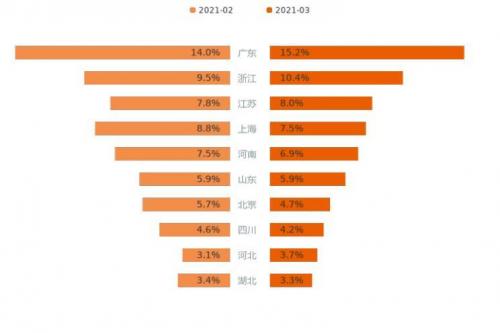 今年3月,用户购车意向占比最高的5个省份包括广东、浙江、江苏、上海、河南,广东以15.2%的意向占比独居鳌头。用户购车意向TOP 10省份意向份额累计达69.8%,相较上月降低0.5个百分点,市场区域集中度有所下降。全部省份中有11个省份用户意向占比有所增加,而7个省份的意向占比出现下滑,其中,广东、浙江、河北相较上月用户意向占比分别增加1.2%、0.9%、0.6%,为意向占比增长最高的3个省份;上海、北京、河南用户意向占比分别减少1.3%、1.0%、0.6%,为下降最多的3个省份。