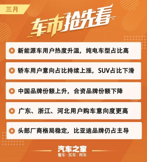 3月份新能源车用户热度告别持续两月的下滑态势,用户选车热情迎来爆发式增长。新能源车用户意向占比开始止跌回升。从车型级别来看,轿车用户热度持续增长,更为用户关注;从厂商类型来看,中国品牌汽车购车意向份额提高,合资品牌份额则下降;从价区走势来看,低价市场逐步扩张,更为广大用户接受,中高价区意向份额持续下滑。整体来看,3月市场呈现了逐步回暖的态势,随着4月份上海车展的到来,市场热度将会进一步升温,大家一起拭目以待吧!