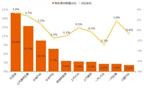 纵观3月市场,TOP 10厂商用户购车意向占比累计达71.2%,相较上月份额增加3.4个百分点,市场集中度进一步提升。十个厂商中,有5个厂商用户意向占比实现上涨,份额增幅最大的厂商为比亚迪,以3.4%的增幅领涨TOP 10厂商;跌幅最大的厂商为一汽-大众,下降比例为2.7%。中国品牌厂商仅有吉利汽车、长城汽车跻身TOP 10榜单,用户意向占比分别为3.7%、3.6%。比亚迪、上汽通用五菱仍为用户最为青睐的两个厂商,用户意向占比分别为19.9%、15.4%。