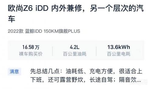 “先总结几点:油耗低、充电方便,很适合上下班,还可露营野炊,长途自驾;隔音效果好、动力强且平顺,关上车窗,低速除了电机声几乎没有其它声音,高速状态好像也只有胎噪,强烈的推背和丝滑的动力让我一直感觉物有所值,感觉和燃油车就是不一样的物种;很智能、很好看,智能化功能非常多,而且很多都非常使用,整车内外颜值很高,很合我这个颜狗心意。”