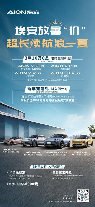 7月1日,埃安继续加码推出“埃安放暑价,超长续航浪一夏”的购车福利政策。7月1日至8月31日期间,购买埃安车型,至高享受3年10万0息的限时金融方案、至高6000元的置换补贴,还有价值4999元的“新车充电礼”、“半价抢智驾”等福利。