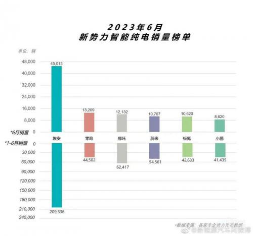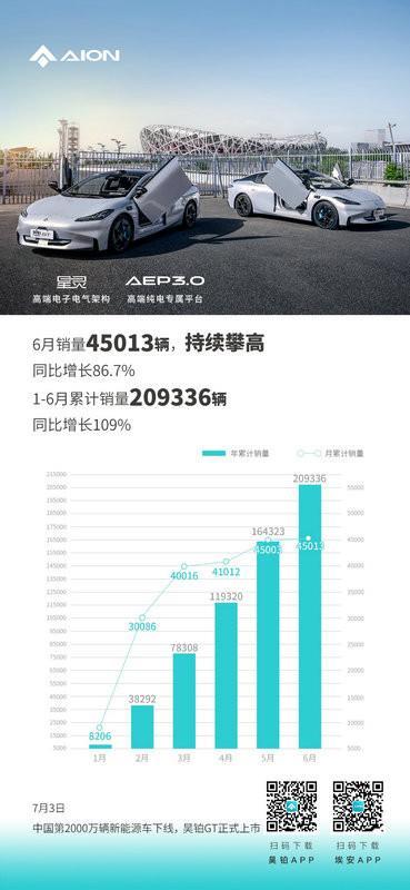 2023年过半,各大车企争先发布上半年销量战绩。埃安6月销量45013辆,持续攀高。从今年3月起,连续四个月销量超过4万辆,上半年累计超20万辆,与去年同期相比实现翻倍。