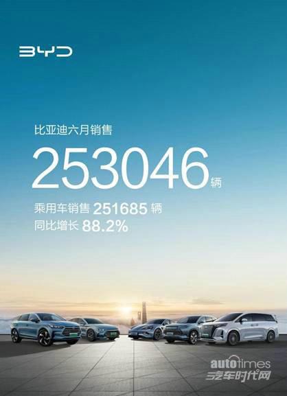 比亚迪汽车6月销售253046辆,同比增长88.2%。今年上半年,比亚迪汽车累计销量已达125.56万辆,其中海外累计销量7.43万辆,上半年累计销量同比增长95.8%,再次刷新中国新能源汽车月销记录,以绝对优势稳坐全球新能源汽车销冠,带动新能源汽车产业加速向前。