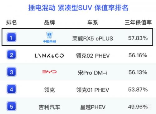荣威RX5 ePLUS以57.83%的保值率位列插电混动紧凑型SUV(三年保值率)榜单第一。荣威RX5 ePLUS凭借沉浸式驾乘空间、主动净化健康舱、流畅的人机交互体验、激情畅快驾感等出圈品质,再次定义智慧出行。