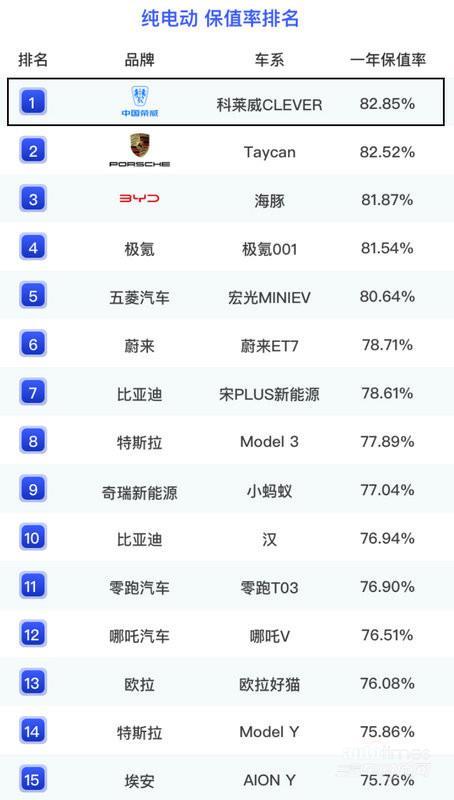 科莱威CLEVER以82.85%的高保值率斩获纯电动车(一年保值率)榜单首位。科莱威CLEVER凭借浪漫个性的外观、领潮时尚的驾乘品质、高电池安全标准等全面领先实力,为年轻用户带来超好开、超省钱、超安全的无忧出行体验。
