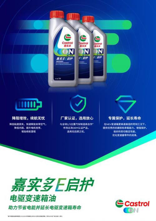 如今,嘉实多E启护电动车变速箱油再添新品,能在新能源汽车变速箱更高速、更高扭的苛刻工况下,提供出色的抗磨损和承载能力,有效增强车辆保护。同时,全新产品可以有效降低粘度损失,快速释放夹带空气,降低内阻,提升电机效率,延长行车里程。全新嘉实多E启护电动车变速箱油可适用于市面上的主流纯电动及混动车型,真正实现“传动高效,里程无忧”的绿色出行体验。