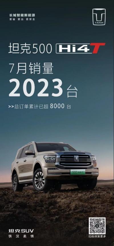 本月,坦克品牌首度公开新能源车型销量,旗下首款量产新能源越野车——坦克500 Hi4-T畅销2023辆,总订单累计已超8000辆,上市“首战”告捷,正式开启越野新能源时代。