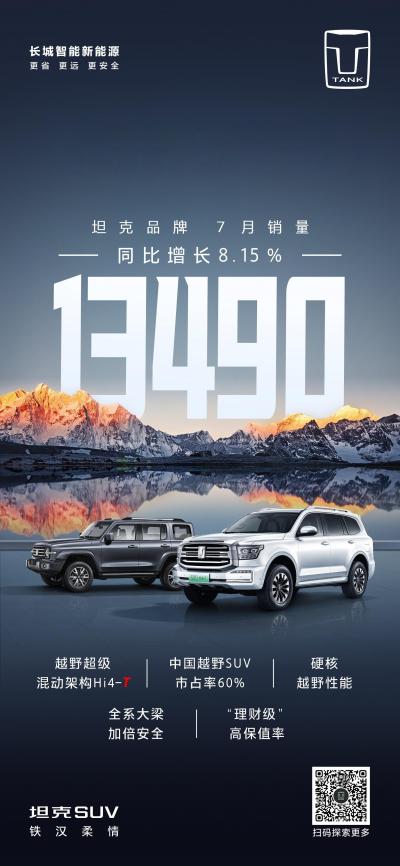 8月4日,长城汽车发布7月产销数据,销售新车109,091辆。其中,高端豪华越野SUV坦克销售13,490辆,同比增长8.15%,延续强劲热销态势,再创年度销量新高。截至7月末,坦克品牌累计销量突破280,286辆,连续31个月蝉联中国硬派越野SUV销量冠军。