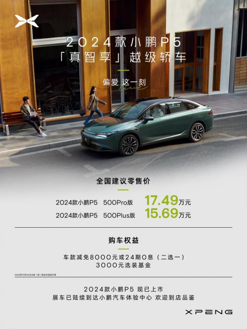 继2024款小鹏G9问世仅一周,小鹏汽车再度发力新产品,2024款小鹏P5正式上市,全系共推出2款配置车型,售价区间15.69-17.49万元。用户购车可享车款减免8000元或24期0息(二选一)、3000元选装基金等多项重磅购车权益。