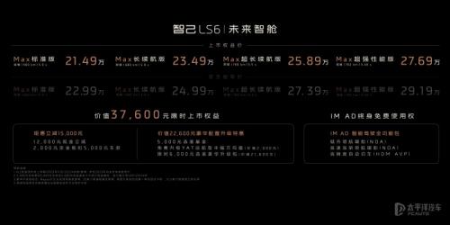 智己LS6比较突出的亮点包括设计出众,符合主流审美;尺寸很多。长宽高分别为4904/1988/1669mm,轴距为2950mm,比特斯拉Model Y和小鹏G6都要大不少。内饰豪华,配备大尺寸升降式双联大屏,尺寸分别为26.3英寸和12.3英寸,同时中央通道区域内嵌有12.8英寸大屏。