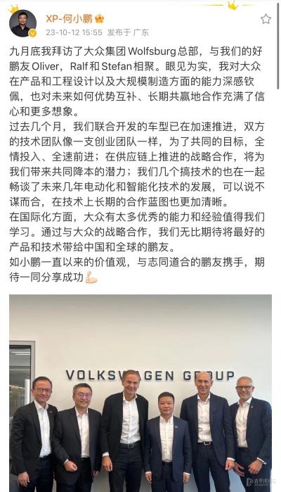 10月12日,小鹏汽车CEO何小鹏在社交平台透露与大众汽车合作的最新进展,何小鹏表示自己在9月底拜访了大众集团Wolfsburg总部,对大众在产品和工程设计以及大规模制造方面的能力深感钦佩,也对未来如何优势互补、长期共赢地合作充满了信心和更多想象。