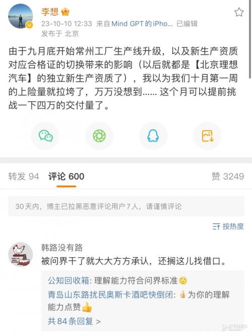 对于这份成绩单,李想却表示:本以为十月第一周的上线量拉胯了,玩玩没想到......这个月可以提前挑战一下四万的交付量了。不过网友似乎并不买单,留言到:被问界干了就大大方方承认,还搁这找借口。对此,大家怎么看?
