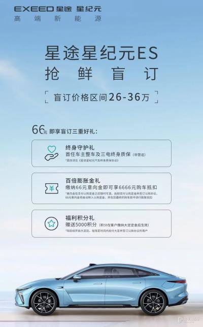 10月16日,2023奇瑞科技DAY期间,星途星纪元ES正式开启盲订,盲订价格区间26-36万元,并推出盲订三重大礼,即日起,用户下订66元即享“整车及三电终身守护礼、6666元膨胀金礼、5000积分礼”订车权益。
