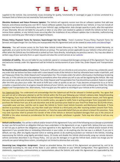 该条款还规定,如果买家在拥有Cybertruck的第一年内出售,特斯拉可以提起诉讼,要求赔偿5万美元,并且特斯拉可以拒绝向违反这一规定的人出售未来的车辆。但由于遭到客户和粉丝的强烈反对,特斯拉后来从公开的协议副本中删除了这一条款。