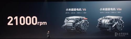 在前驱技术部分,小米汽车给我们带来了小米超级电机V6、V6s以及V8s三款电机。其中V6电机的最高转数达到21000rpm,峰值功率为220kW,峰值扭矩为400N·m,支持400V电气电压架构。