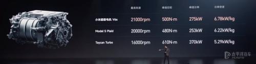 入门的小米超级电机V6看完了,再来看看性能更强的小米超级电机V6s。V6s电机的最高转数达到21000rpm,峰值功率为275kW,峰值扭矩为500N·m,支持800V电气电压架构。发布会上雷总也毫不客气的拿V6s电机与特斯拉Model S Plaid以及保时捷Taycan Turbo搭载的电机进行对比。