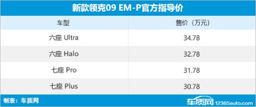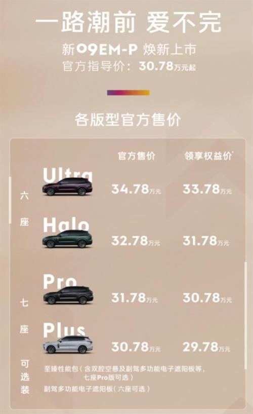 1月16日,新领克09 EM-P正式上市,此次上市新车共推出4款车型,售价30.78-34.78万元。同时,官方还推出领享权益价,四款配置车型均可优惠1万元(详情请咨询当地经销商)。