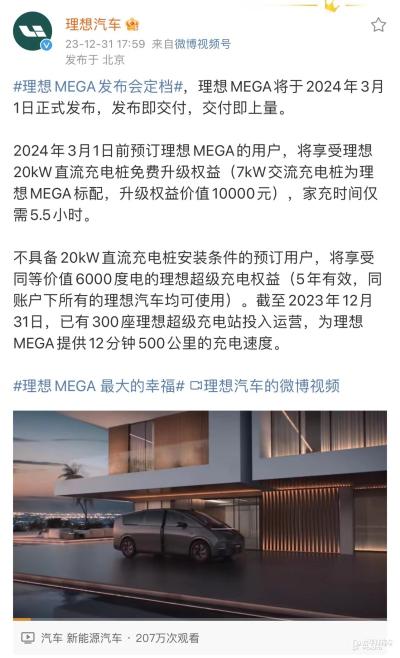 而在12月31日,理想汽车宣布新车将在3月1日上市,并推出了最新的预订权益。在2024年3月1日前预订理想MEGA的用户,将享受免费升级20kW直流充电桩的权益(7kW交流充电桩是标配,升级价值10000元),这样家充时间仅需5.5小时。